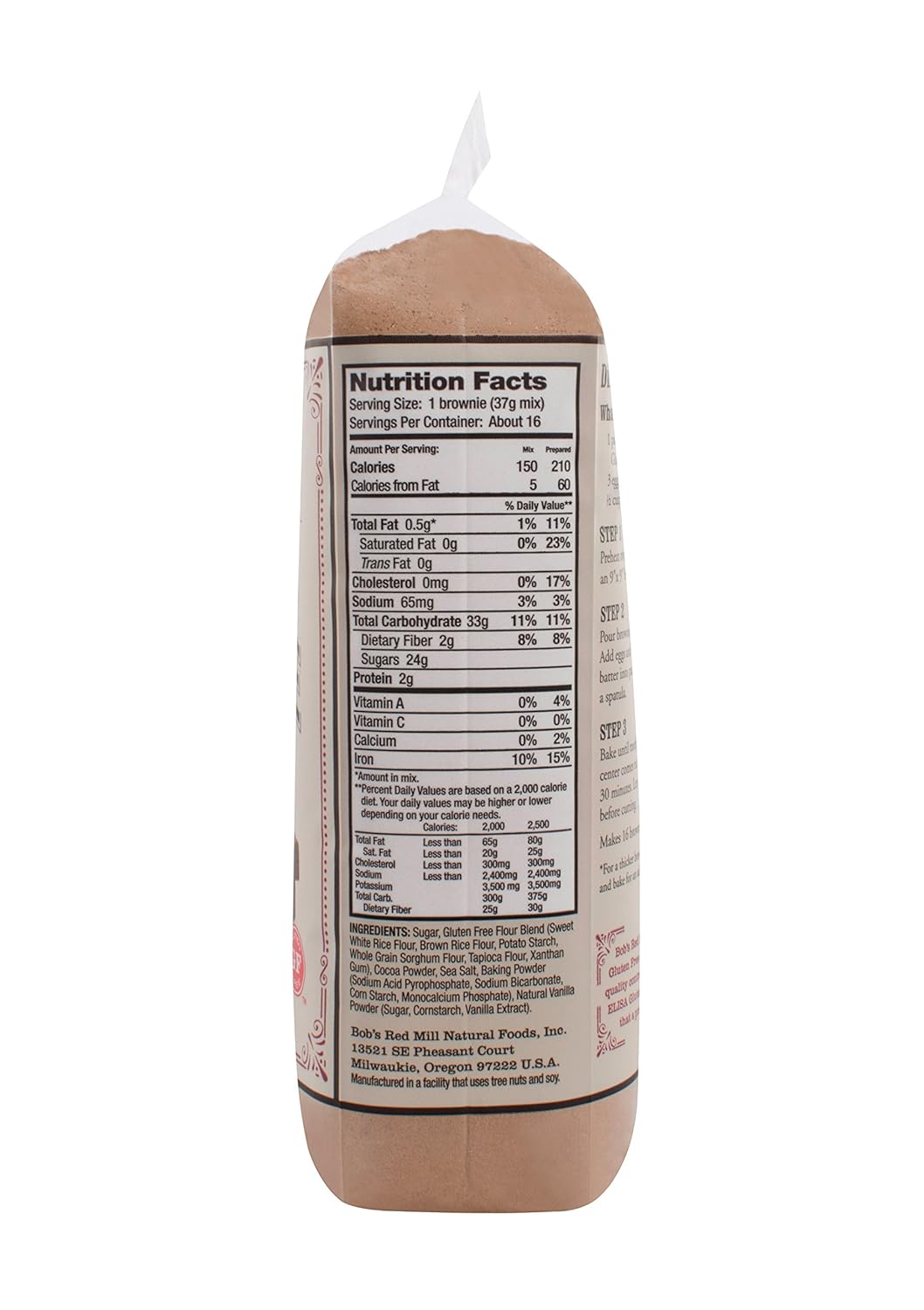 Product Description Indulgently rich chocolate with a satisfying fudgy texture. Bob's Red Mill Gluten Free Brownie Mix is our unique blend of flours and ingredients crafted to give you a little taste of childhood. Easy to prepare; all you need are eggs and butter (don't forget your favorite toppings, too). Give them 30 minutes to bake, a little longer if you like a thicker brownie, then treat yourself to this delicious gluten free treat. Bring the unmistakable aroma and taste back to your home with our Gluten Free Brownie Mix. About the Brand Bob Moore's secret to life may just be "work hard and keep it simple." Living this philosophy, Bob literally puts his nose to the grindstone every day. Bob's Red Mill Natural Foods is an Oregon-based company that utilizes simple, old-world technology to mill hundreds of all-natural whole grain products. Bob's Red Mill is dedicated to the manufacturing of natural foods in the natural way. In their own words: "With all the sophisticated knowledge of recent times, no machinery has yet been developed that grinds grains into flour quite as well as our flint-hard quartz millstones quarried in France and used by discriminating millers since early Roman times." "Our well-dressed (sharpened) sets of millstones turn the highest quality wheat into a finer, better baking bread flour than all the hammer mills, steel roller mills, steel buhr mills, or pulverizers ever built! These slow turning millstones grind the bran, endosperm, and germ (containing its nutritious wheat germ oil) into flour in a cool natural way, creating a more assimilable food." Bob's Red Mill stone grinds all common and most uncommon grains into flours and meals on its over 100-year-old mills. They mix them into an astounding array of unique cereals, pancake and waffle mixes, machine and hand-made bread mixes, quick bread mixes, gluten-free mixes, and specialty grain products.