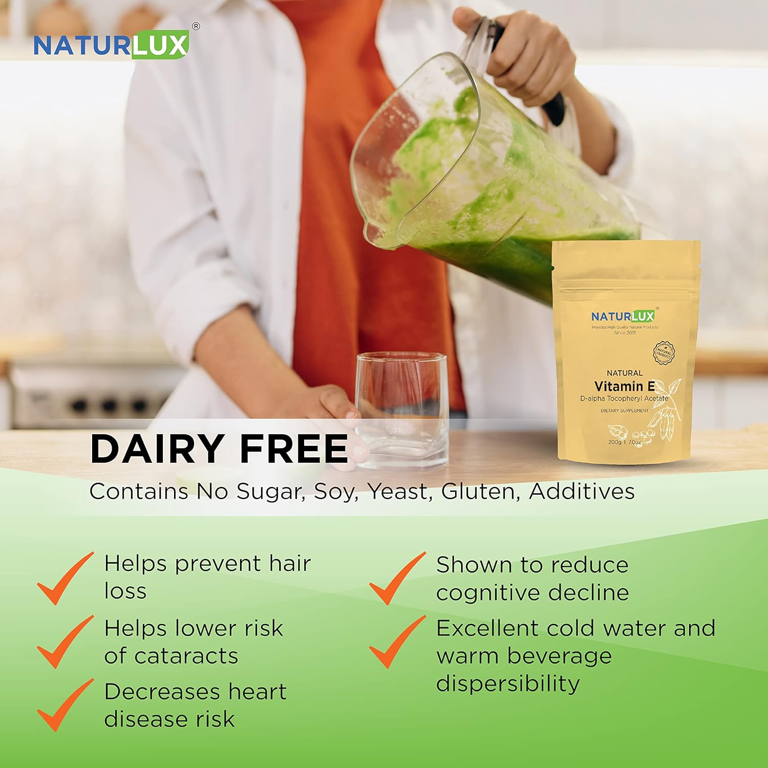 Naturlux D-Alpha Tocopheryl Acetate, Vitamin E Extracted and refined from natural vegetable oil. The biological activity is dozens of times of synthetic vitamin E, easy to be absorbed by the human body; Oxidation ability is 100 times stronger than the finished product; high safety, non-toxic and no side effects. *This product has an activity of 1360IU as an oily liquid, and an activity of 700IU as a fine powder solid.